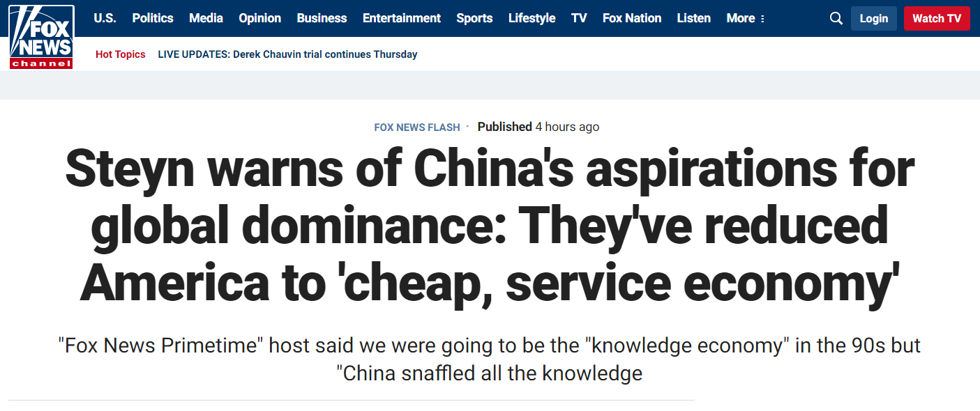 问自答道:“来斯坦恩接连自,的屋子看看你,都是中国缔造内中通盘东西,盘子和劣质的T恤不光仅是厨房里的。)90年代被见告咱们正在(上世纪,不擅长缔造幼玩意和衣服放弃缔造业吧——美国人;担忧但别,‘常识经济’咱们首倡的是。若何回事但不知福克斯主持人抱怨美国被中国,了通盘常识中国盗取,有札记本电脑和智内行机以是他们缔造了咱们所,和5G工夫又有了华为。”